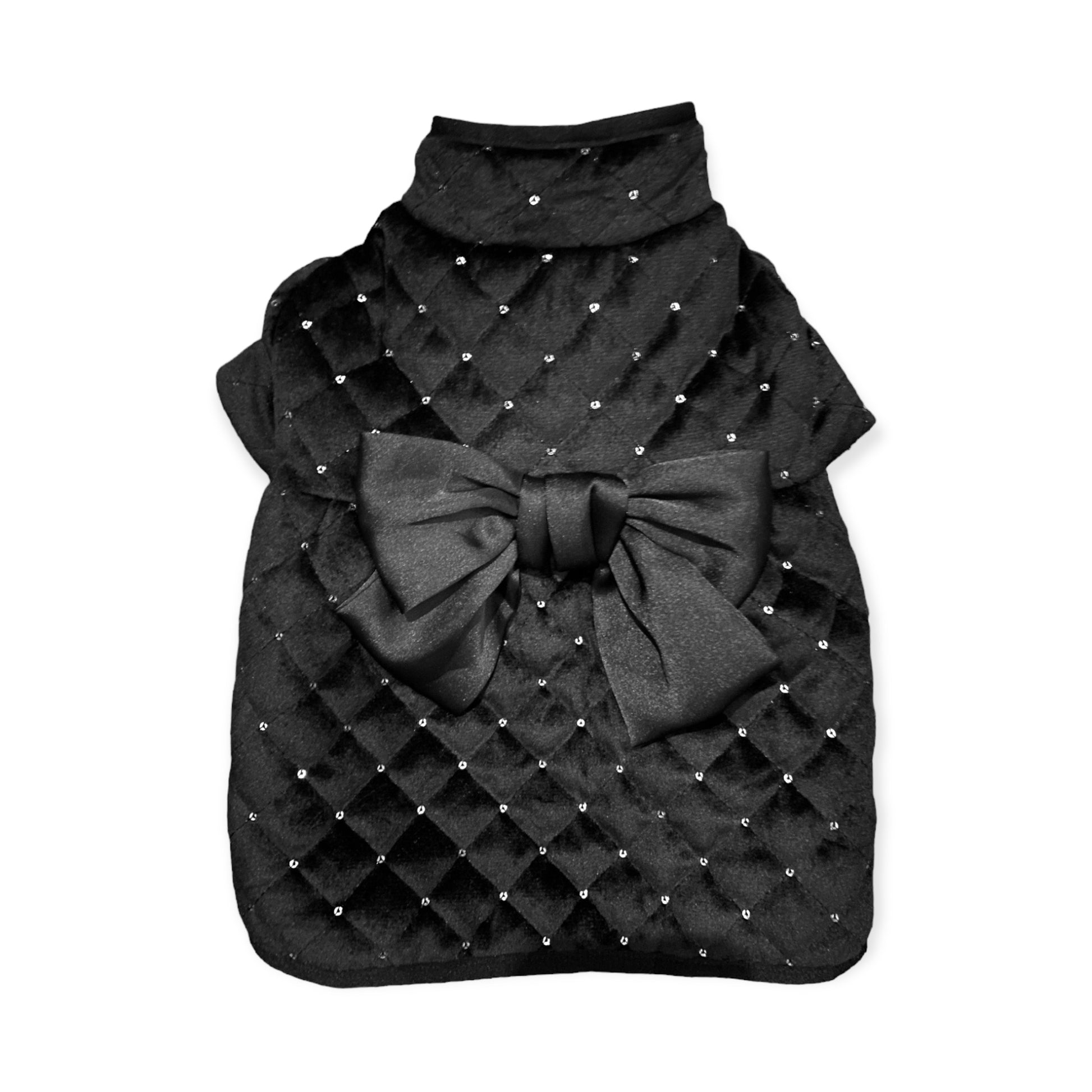 Lyxig vinterjacka till din hund. Hundjackan är i sammetsliknande material och har en dekorativ rosett och är täckt med små gnistrande kristaller.
