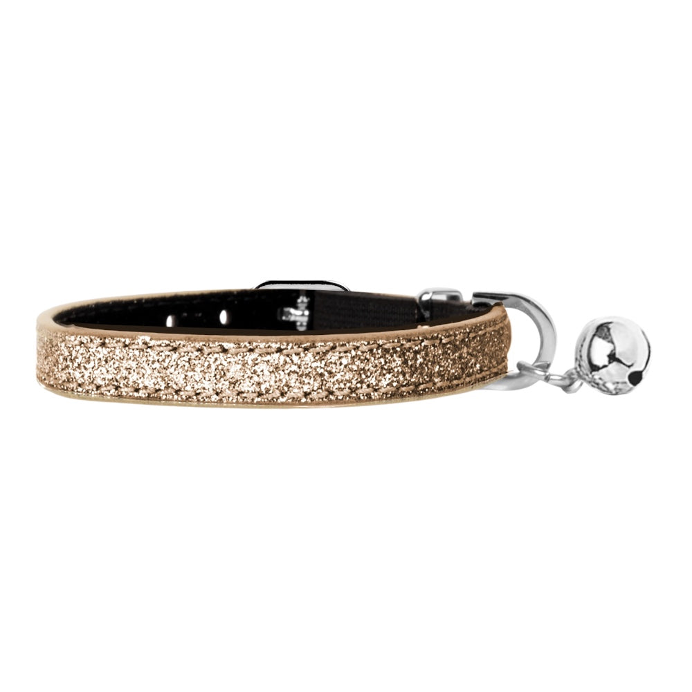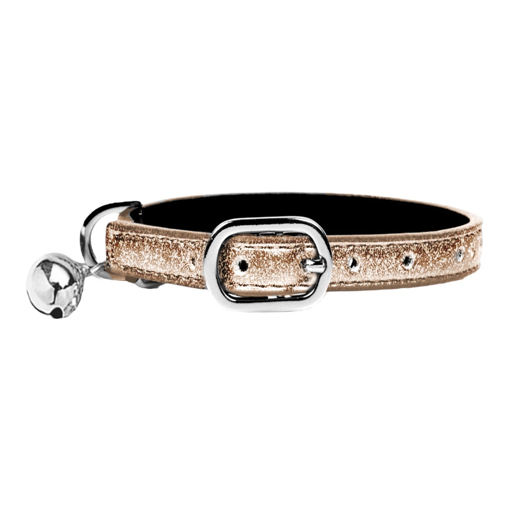 Katthalsband i glittrigt läder för vuxna katter. Justerbart mellan 22-26 cm och har en bredd på 1 cm Halsbandet haren liten bjällra som går att ta bort vid behov. Detta katthalsband kan användas med koppel.